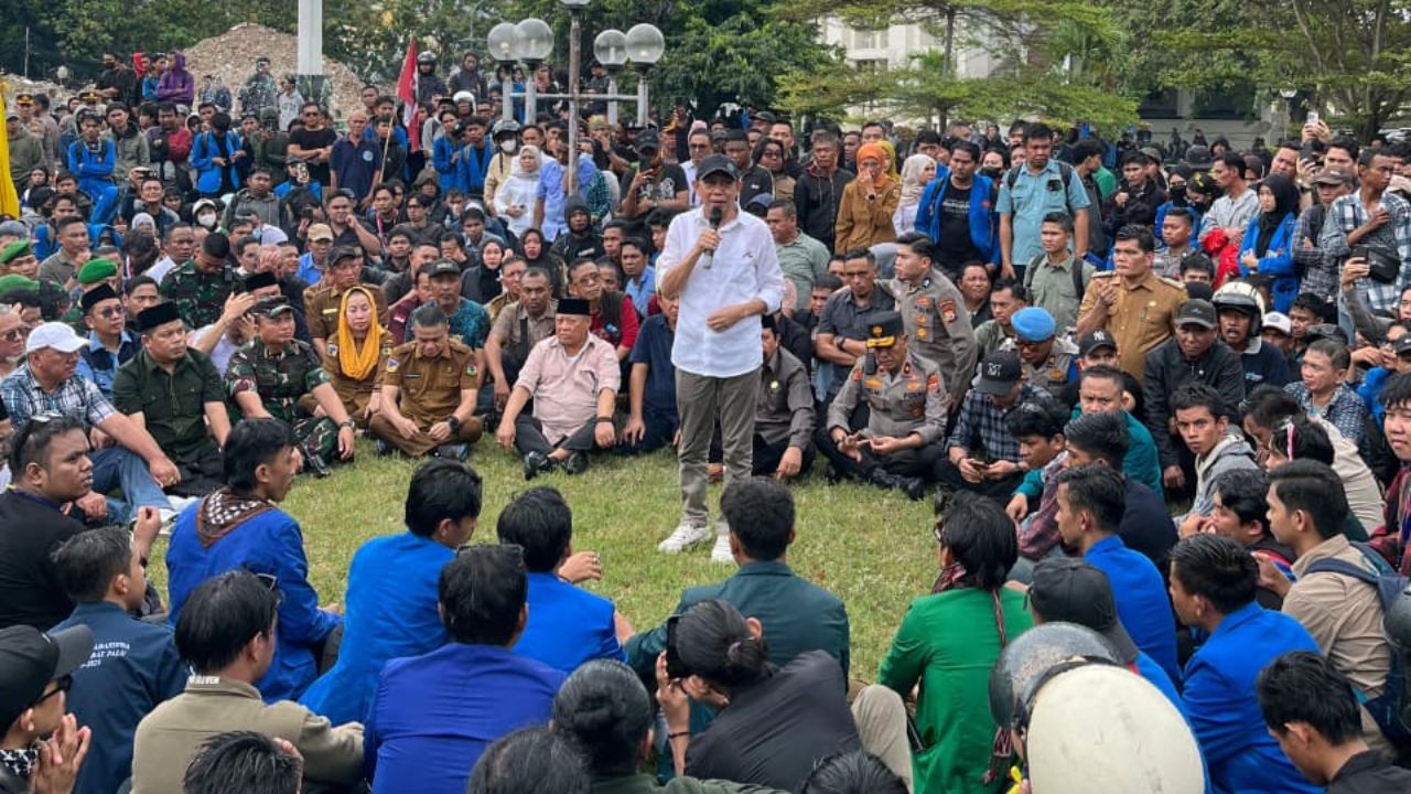 Siang itu hujan turun perlahan. Suara orasi mahasiswa mereda setelah pimpinan dan anggota DPRD Sulteng menemui massa aksi untuk berdialog.