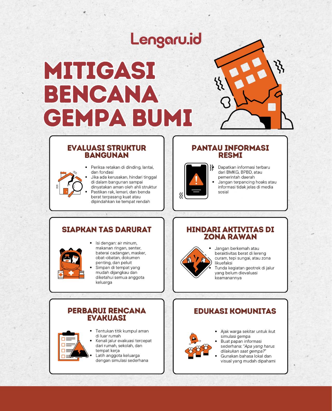Jika dianalogikan, gempa bumi seperti getaran saat menarik meja yang penuh barang. Bila getarannya terlalu cepat, maka barang-barangnya bisa jatuh atau roboh. Oleh karena itu, jika terjadi gempa bumi maka harus segera mengevakuasi diri keluar dari ruangan.
